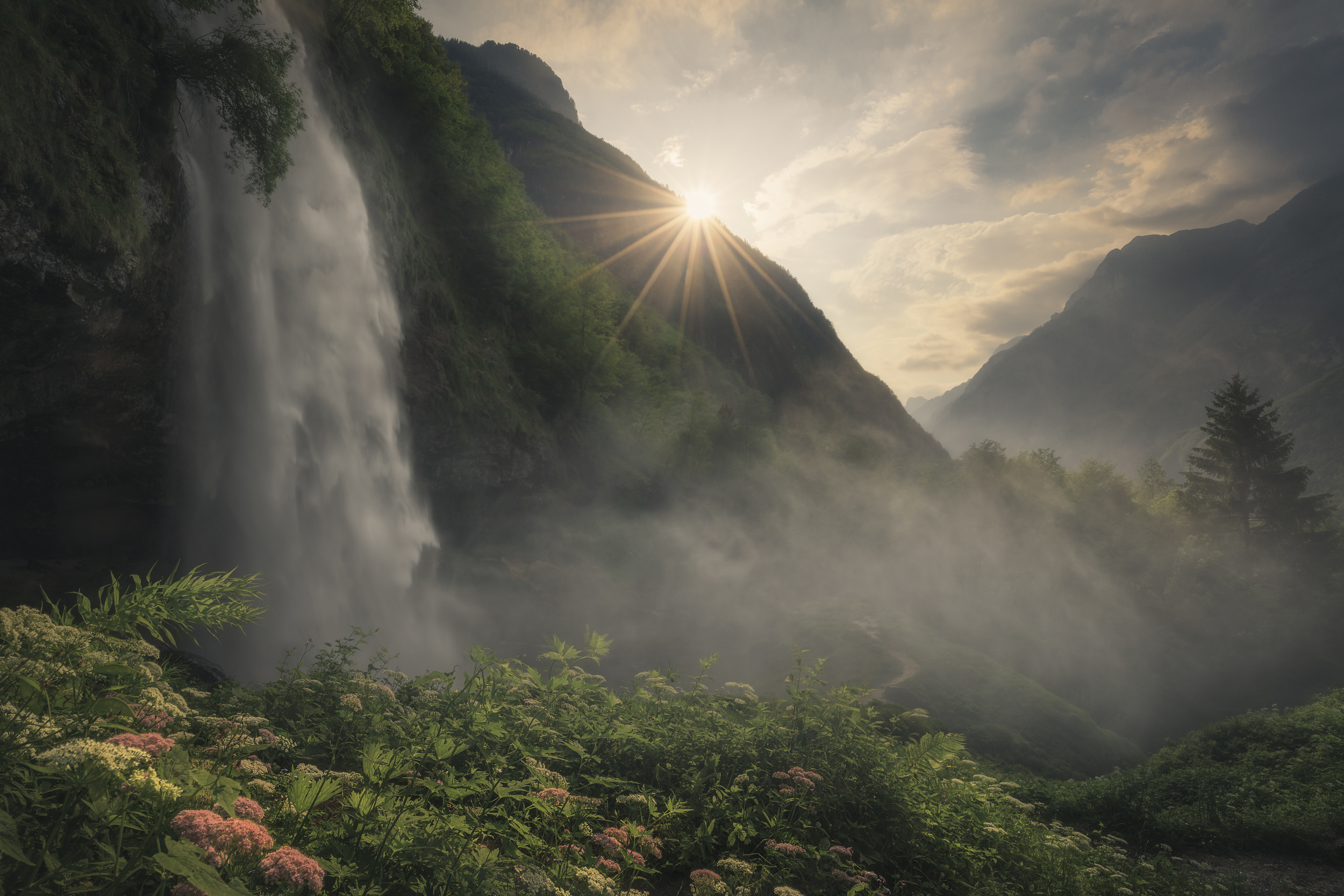 It was one of the most difficult photos to take, due to the prohibitive climatic conditions. I know the place very well, I know that in mid-June the water flow is considerable due to the melting of the snow. I had studied the parable of the sun, but I did not imagine finding such a strong wind. The water vapour of the waterfall was very intense, it bathed everything at a distance of several meters. I had very little time to be able to catch the sun in the right place. When I opened the raws on the pc I was very nervous because I did not know if I was able to take any successful photos. After all the post production work, I can say that I am satisfied.